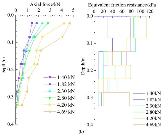 Axial force and equivalent friction resistance of model pile: (a) Ordinary pile; (b) screw pile.