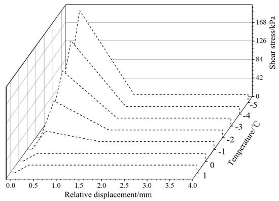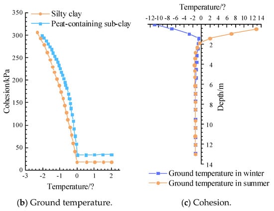 The soil around the pile is 10 times the pile’s diameter, meaning it spreads 12 m in the horizontal direction, and the soil depth is 1.5 times the pile’s length, meaning it continues 18 m in the vertical direction, which is indicated in Figure 7a. The soil layer consists of silty clay (0~6 m) and sub-clay containing peat (6~12 m). The water content of both of the two kinds of soil is approximately 40%. Previous studies [8,9] reveal that the mechanical properties of the two types of soil are closely related to temperature: their cohesion is greatly affected by temperature change, and the internal friction angle of the soil is close to 0 °C under negative temperature conditions. The change in the soil cohesion with temperature is depicted in Figure 7b [11,12]. The temperature field was assigned to the model by way of a pre-defined field, and the temperature field is indicated in Figure 7c. The pile’s body is subjected to frost heave during loading in February in winter, which was simulated by applying prestress onto the surface of the active layer on the side of the pile. The Coulomb friction model was used on the contact surface of the melting active layer, and the friction coefficient was 0.28. The bond model was used to simulate the characteristics of the frozen soil’s contact surface by defining the maximum damage strength and the influence curves of temperature on the shear characteristics of the contact surface, as depicted in Figure 8 [9].