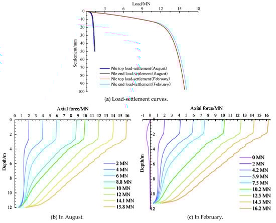 Figure 9a indicates the load-settlement curves of the screw pile loaded underground during typical temperatures for February and August. It can be observed that the ultimate bearing capacity of the pile’s foundation is less affected by the ground temperature, and the difference between the ultimate bearing capacity of the pile’s foundation in February and August is 412 kN. The bearing capacity of the pile’s foundation is primarily provided by the pile’s side, and the end bearing force accounts for less than 10.1%.