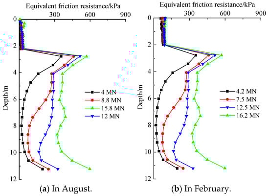 Figure 10 indicates the variation curves of the equivalent friction resistance of the pile’s side with depth in February and August. Figure 10a,b indicate that the lateral friction resistance in the seasonally active layer in August is approximately 25 kPa, and the freezing force between the seasonally active layer and the smooth surface of the steel protective cylinder in winter reaches 95 kPa. The equivalent frictional resistance of the starting and ending thread sections is 2.0–2.5 times that of the middle section. Xu Liang’s [21] test results also revealed a similar phenomenon. The reasons were as follows: the displacement of the thread in the upper part of the pile’s thread was larger than that in the middle part of the pile’s thread; the bearing capacity of the soil at the bottom of the upper part of the thread was developed quickly; and the load-sharing ratio was high. The lower side of the bottom of the thread section was unaffected by the stress on the other thread sections, and the bearing capacity of the lower part of the soil was higher than that of the middle part.