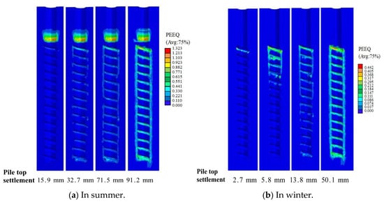 The equivalent plastic strain zone around the pile is depicted in Figure 11. Under summer loading, the soil strength of the seasonally active layer is low, and the equivalent plastic zone at the junction with the frozen soil is concentrated, while the freezing strength of the active-layer soil in the winter is high. Because the contact surface is smooth, the pile–soil freezing force is much smaller than the frozen strength of the soil, resulting in no plastic deformation in that zone. The plastic zone of the pile side’s thread section first appears in the initial section and gradually expands with the increase in the load until the plastic zone around the pile is fully connected, and the soil at the pile’s side appears to exhibit shear failure.