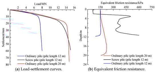 As indicated in Figure 12a, the load-settlement curve of an ordinary cast-in-place pile with a length of 20 m demonstrates a steep drop when the bearing capacity reaches 14.24 MN, which belongs to the typical failure mode of a friction pile. The load-settlement curve of an ordinary cast-in-place pile with a length of 12 m indicates a steep drop when the bearing capacity reaches 7.30 MN, which is a typical form of friction pile failure. When the pile length of a screw pile is only half that of an ordinary pile, its ultimate bearing capacity can approach that of an ordinary pile. The lateral frictional resistance of the three piles is depicted in Figure 12b. For ordinary piles, the frictional resistance gradually increases with depth and loading. In contrast, the effect of depth on the equivalent frictional resistance of the screw pile is relatively small. The screw pile and the soil occlude each other, resulting in a higher equivalent friction resistance of the pile’s side at the beginning and the end of the thread than that of the conventional pile type, which is significantly different from the conventional pile type.