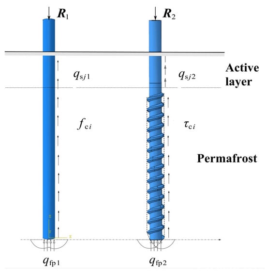 Due to the mechanical interaction between the pile thread and the soil, the shear strength of the permafrost determines the bearing capacity of the pile foundation, and the shear strength of the frozen soil is greater than the freezing strength of the pile–soil contact surface [8,9]. Therefore, the method used to estimate the vertical bearing capacity of the pile foundation by using the freezing force of the soil and the pile’s body in the design code [22] for building a foundation in a frozen soil region is not suitable for the drilled screw pile. Figure 13 depicts the schematic diagram of the calculation method of the code, according to the results of the model test and the numerical analysis; the revised formula is as follows: