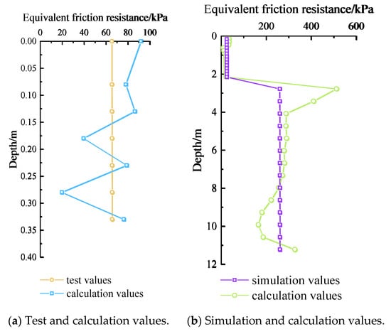 Figure 14 indicates the comparison between the ultimate bearing capacity obtained by the model test, the numerical simulation, and the calculated value. The equivalent frictional resistance obtained from the model test presents an uneven distribution. Generally, the lateral resistance calculated by the modified specification is close to the test result. The distribution trend of the simulated friction resistance is obvious. The equivalent friction resistance of the top and bottom sides of the thread is much greater than the calculated value according to the revised code. The calculated value of the middle section is consistent with the revised code, indicating that the calculated result of the revised code is safe and is suitable for estimating the vertical bearing capacity of drilled, cast-in-place piles in permafrost regions.