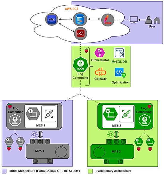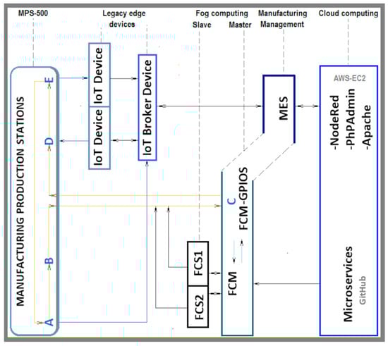In a previous study [17], the digital transformation of a FESTO MPS 500 modular production process was carried out which is made up of five work stations in its production line: distribution (A), machining (B), quality control (C), storage (D) and classification (E) for the transitioning from Industry 3.0 to Industry 4.0. This required the integration of specialized hardware and software at different levels and layers within the RAMI 4.0 reference model, as well as lightweight communication protocols, cloud and fog computing, an MES, and advanced technologies that were integrated, such as artificial intelligence, local and cloud database management, computer vision for product quality control, computer vision for facial biometric operation, and from the Fog Computing Master (FCM), temperature management of the fog computing agent nodes (FCS), thus ensuring the available processing resources of the MES, as shown in Figure 1. This study demonstrated the feasibility of integrating several emerging technologies in Industry 3.0 to scale up to Industry 4.0.