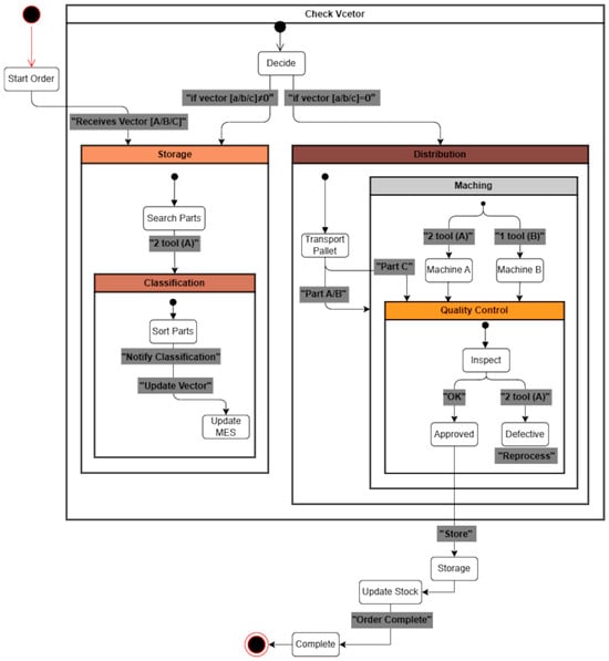 With a second MES, requests will be processed immediately and sent to MPS2 for possible market changes. In this context, this new MES was developed with the same characteristics as the initial MES, whose control flow was designed based on states to optimize order management. That is, the process begins when the MES’s order buffer receives a vector sent from the FC node. In this arrangement, the quantity and type of parts to be processed are identified according to their index and value (Status: Order Start). Subsequently, the MES requests the warehouse to locate the type of part (Status: Warehouse Locates Parts). Once identified, it is sent to the next station for classification and immediately notifies the MES of the current status (Status: Parts Classification) to update the vector by subtracting the processed units . If the quantity of the product type is not zero , then the request process to the warehouse is repeated, but if it reaches a value of zero , then the Pallet is transferred to the distribution station to begin the process of replenishing parts in the warehouse (Status: Distribute Pallet). Once the Pallet is at the machining station and depending on the type of part, the corresponding tools are activated, i.e., two tools for Part A, one tool for Part B, and no tools for Part C (Status: Machining Parts). The parts are then sent to the quality control station (Status: Quality Control). Those parts that are verified correctly are stored in the warehouse (Status: Storage); otherwise, they will be reprocessed. When has completed the vector order, the MES captures images of the warehouse shelf and runs machine vision to determine the Stock of products in the plant (Status: Update Stock), thus completing the cycle (Status: Complete Order). The transitions between states are governed by the order vector, which operates as the central control axis between the MES and the sorting and distribution stations. Figure 3 shows a diagram based on the states executed by the MESs, indicating the order preparation process and the parts replenishment process.