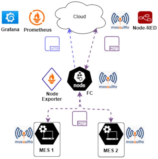 The process just shown is made possible by a Python v3.9.16 script developed for the FC node, which concurrently executes multitasking using the multithreading library to perform the following: downloading orders from the cloud, storing them in a local database (port 3306 enabled); orchestrating tasks decided by a hybrid algorithm based on integer linear programming (ILP); monitoring information from MESs (stock, energy consumption, and production time); and the use of a Node Exporter tool (port 9100 enabled) to measure FC node performance metrics and MQTT/TLS communication (port 8883 enabled) between MESs, FC nodes, and the cloud, in a manner consistent with IEC 62443 industrial automation system network security [32]. It is also mentioned that interoperability with the cloud is possible due to the endpoints available, such as Node-RED, Prometheus, and Grafana, where the first is part of the extended architecture. The other two are not as they are used exclusively to visualize the metrics of the FC node targets (ports 9090 and 3000 enabled) and thus analyze their performance.
