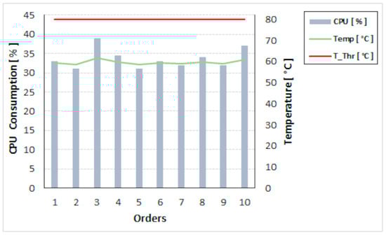 On the other hand, the averaged performance metrics were monitored from the Raspberry Pi 4 (RPi4) hardware with 4 GB of RAM from the FC node. The data were collected as order requests were made, meaning that the tasks to be performed by the FC node were concurrent, involving the following: downloading requests, storing them in a local database, orchestrating orders, and processing data published from the MESs. Considering the aforementioned tasks as a global process performed on an FC node, the following average performance metrics were recorded during the orchestration of 10 orders (see Figure 5), with an average CPU consumption of 36% and an average temperature of 61 °C, a value that is below the thermal throttling (T_Thr) threshold and is therefore stable in its operation. However, to avoid possible approaches to this critical temperature limit, it was decided to maintain forced ventilation during the period of orchestration of all order requests to the MESs, with an average execution time for task assignment decision-making of 900 [ms].