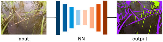 In this study, we employed a convolutional neural network (CNN) architecture tailored for semantic segmentation to perform pixel-level weed detection in rice field images. The model adopts an encoder–decoder structure and was selected based on its demonstrated performance in previous segmentation tasks, as well as its availability as a pre-trained architecture suitable for fine-tuning through transfer learning techniques. Inference by the network is performed as shown in Figure 1.