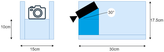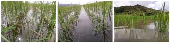 For dataset construction, we acquired videos in MP4 format using a Raspberry Pi Camera V2 (Raspberry Pi Foundation, Cambridge, UK) mounted on a boat designed to simulate an aquatic drone that was 15 cm in width, 30 cm in length, and 17.5 cm in height (Figure 2). The camera was controlled using Raspberry Pi 4 and mounted in front of the boat at a downward angle of 30°. The video resolution was set to 640 × 480 pixels, with a frame rate of 30 fps. During data collection, the boat was manually pushed from behind to navigate between rows of rice plants. The videos were recorded in paddy fields located in Niigata Prefecture, Fukushima Prefecture, and Iriomote Island, Japan. These three fields exhibit different environmental conditions, and incorporating images from each location into the dataset contributes to its overall diversity. Figure 3 presents representative examples of images captured at each site. In the Niigata field, weeds tend to grow vertically with elongated stems. In the Fukushima field, low-height weeds are frequently observed around the rice plants. In contrast, the field on Iriomote Island showed a tendency toward sparse weed presence.