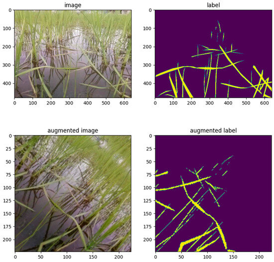 Examples of a paddy field image (upper left) and a correct mask image (upper right) before resizing and data augmentation, and a paddy field image (lower left) and a correct mask image (lower right) after application.