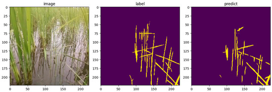 An example of the prediction results for the test data using the bagged UNet++ model is shown in Figure 6. For this image, the model achieved an IoU of 0.437, mIoU of 0.698, precision of 0.720, recall of 0.526, and accuracy of 0.961. IoU was closest to the average values across the entire test dataset, making this image a suitable visual representation of a typical test case. Compared with the GT mask, few instances exist where the model makes incorrect predictions, such as falsely identifying non-weed areas as weeds. Overall, the model demonstrated the ability to accurately identify weed locations in an image. These results suggest that the model effectively learns the features of the weed pixels and successfully detects them.