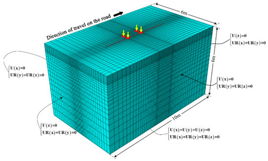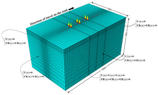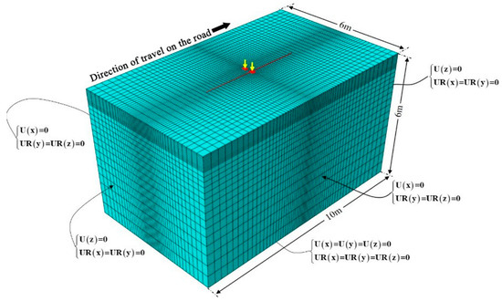 In this study, the semi-rigid asphalt pavement structure is taken as the research object, and finite element software is used to establish the three-dimensional model of the pavement. The size of the pavement structure model is 6 m × 6 m × 10 m. The cell type is an eight-node thermally coupled hexahedral cell, with both transverse and longitudinal boundary conditions fixing only the displacements in their respective directions, XSYMM (U1 = UR2 = UR3 = 0) and ZSYMM (U3 = UR1 = UR2 = 0), respectively, and the bottom boundary condition is completely fixed (U1 = U2 = U3 = UR1 = UR2 = UR3 = 0). Grid division of the structural layer of asphalt pavement is used to increase the number of species and determine the appropriate reduction of the number of soil base species. The final pavement finite-element structure is shown in Figure 1.