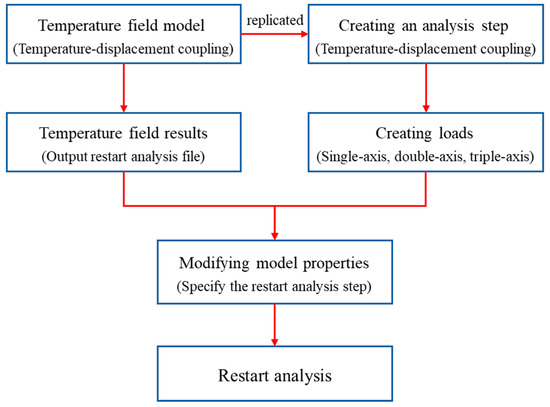 In order to study the structural mechanical response of pavements under temperature and wheel loads, a simultaneous coupled analysis of the temperature field and the load field is required. In this paper, the restart method in finite element software is used to realize this process, which is divided into three main steps [3]. Firstly, the output request for restart data is set up in the temperature stress calculation model. Secondly, the loading conditions are modified on the basis of the temperature stress field calculation model. Finally, submit a calculation assignment for computation. Calculation mainly includes nine kinds of working conditions, such as different temperature fields and different axle loads. Each condition includes 24 restart analysis models. The computational flow is shown in Figure 8.