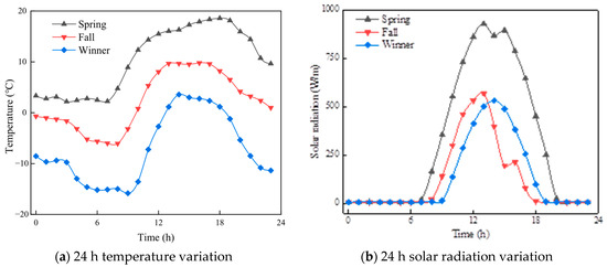 Based on the measured data from a meteorological station along the highway, the large temperature difference in spring and fall and the extreme low temperature difference in winter were selected as typical continuous variable temperature environments. Figure 9 shows the variation of air temperature and solar radiation over a 24 h period under different seasons in the region.