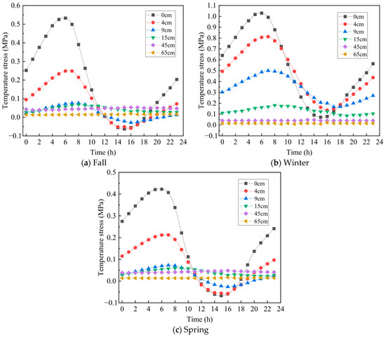 As can be seen from Figure 11, the temperature stresses in each structural layer show a regular variation. Spring and fall seasons show alternating tensile and compressive stresses, and winter seasons show complete tension with little effect of temperature stresses at the base. In terms of daily variation, the road surface temperature stress reached its maximum value at 6:00 in all three seasons, and the maximum compressive stress appeared at 15:00. Combined with Figure 9, it can also be seen that the road surface temperature extremes and temperature stress extremes exhibit the same pattern of change. And the peak temperature and the peak stress appear to be lagged sequentially with depth, and the greater the depth, the longer the lag time. And the longer the lag time of the peak temperature stress is compared to the peak temperature with increasing depth.