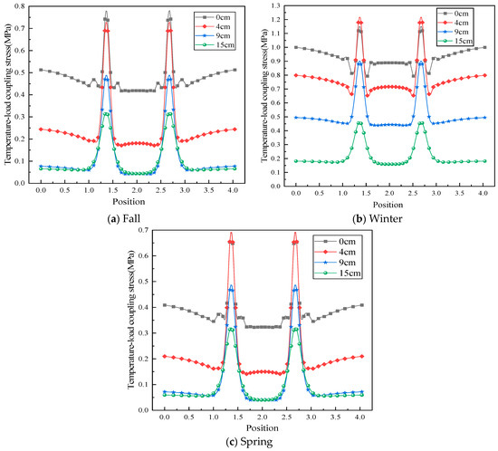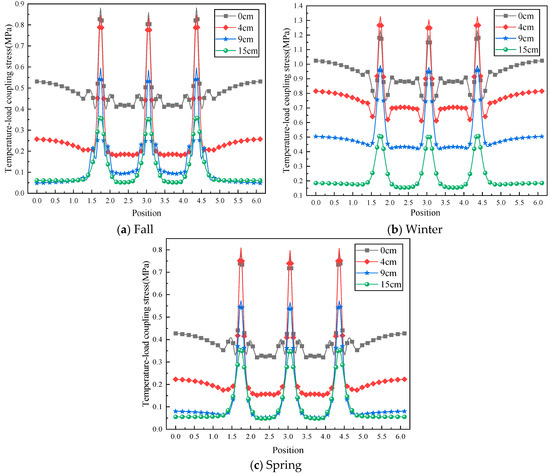The change rule of the coupled load-temperature stress of the double axis is shown in Figure 13. The maximum temperature-load coupling stress under double-axis loading occurs below the wheel load. Secondary high stresses occur on both sides of the wheel load, which gradually disappear with depth. The temperature-load coupling stresses on the road surface in the region of the center of the two-wheel loads alternately change, with temperature stresses at different depths showing a tendency for concave and convex intermediate stress curves. At the time when the temperature stress becomes tensile stress in each layer, 30 cm away from the wheel load edge, the coupled stress action curves with time change show a direct decreasing tendency. By comparing the variation curves of coupling stress on the analyzed path in different seasons, it is found that the temperature stress has less influence on the coupling stress in spring and fall and more influence in winter.
