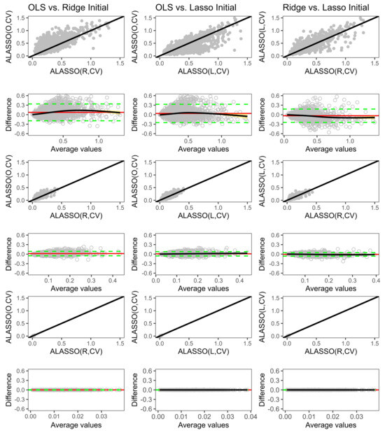 The first and second rows compare the three models in scenarios with limited information: a small sample size (100), low SNR (0.25) ( of about 20%), and high correlation among covariates. These conditions provide little information for accurately estimating both the tuning parameters and initial estimates, leading all initial estimates to produce models with different predictions. This is indicated by a nonzero mean difference (horizontal solid line) and some differences falling outside the wider limits of agreement (LOA) (dashed lines) in the Bland–Altman plot. On average, ridge initial estimates produced models with the best predictions, followed by lasso estimates, while OLS estimates performed the worst.