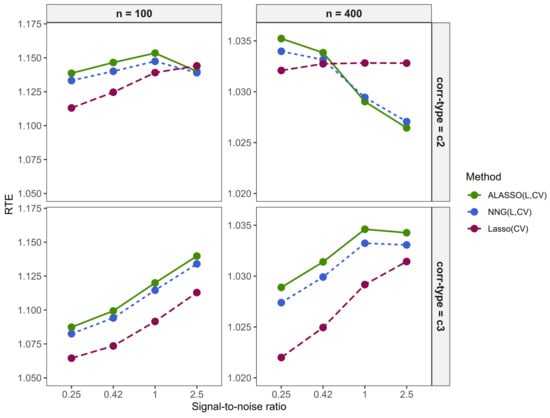 where denotes a random matrix of test covariates, is a random vector of test response variable, is a vector of true coefficients, and is a vector of regression estimates from a regression approach such as NNG. is the model error. A null model (model without covariates) has an RTE score of while a perfect model () has a score of one since ME = 0. A good prediction model should have an RTE close to 1 [40,41].