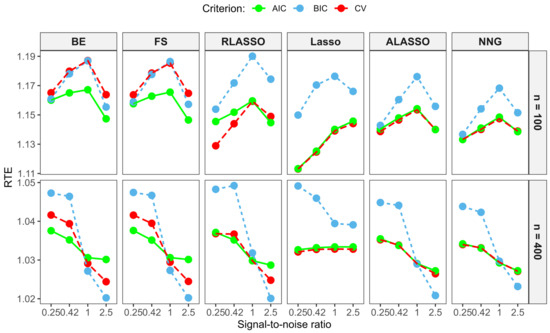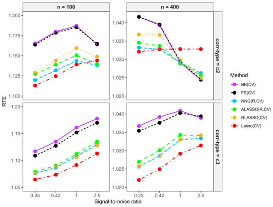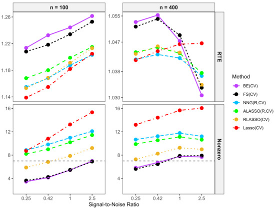 Additionally, the lasso, RLASSO, BE, BSS, and FS, with tuning parameters determined through CV, are denoted as Lasso (CV), RLASSO (CV), BE (CV), BSS (CV), and FS (CV), respectively, as these approaches do not require initial estimates. When AIC or BIC was used instead of CV for parameter selection, “CV” was replaced with “AIC” or “BIC” in the respective method notations. For example, Lasso (AIC) indicates that the AIC criterion was used to select the tuning parameter.