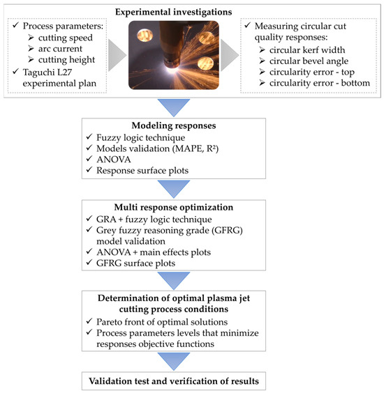 Based on the above literature review, it is visible that there is a space regarding the investigation of the plasma jet cutting process parameter effects on the circular cut quality responses when machining an aluminum alloy. As it is previously mentioned, processing aluminum by thermal manufacturing processes such as plasma can be very demanding and thus it represents a research challenge to determine the process parameter levels that enable close-to-optimum cut quality characteristics. Accordingly, this paper brings a valuable scientific contribution and investigates the influence of the cutting speed, arc current, and cutting height on circular quality responses such as the circular kerf width, circular bevel angle, and circularity error when cutting aluminum alloy 5083. Additionally, this paper presents a novel scientific methodology in solving the multi-response optimization problem, which means a hybrid approach that is a combination of grey relational analysis and the fuzzy logic technique. The grey–fuzzy hybrid approach enhances traditional GRA by integrating fuzzy logic, an artificial intelligence (AI) technique, to more effectively manage uncertainty and imprecise data—particularly prevalent in manufacturing processes. Unlike standalone GRA, which relies on fixed weights and crisp values, the fuzzy component allows for adaptive weighting and linguistic evaluation, thereby improving the robustness and flexibility. Compared to other AI methods, such as artificial neural networks, the grey–fuzzy approach offers greater interpretability and eliminates the need for large data sets or intensive training, making it a more practical and efficient solution for multi-response optimization in complex or non-conventional manufacturing systems. This approach derives optimal solutions of a few analyzed circular quality responses and determines corresponding process parameters levels that result with a close-to-perfect circular cut quality. Finally, here, the derived findings can be successfully implemented in real industrial cases. The methodology framework of this paper is presented in Figure 1.