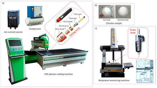 Experimental setup: (a) CNC plasma cutting machine setup, (b) example of circular samples (top and bottom view), and (c) circular responses’ measuring machine TESA Micro Hite 3D 454.