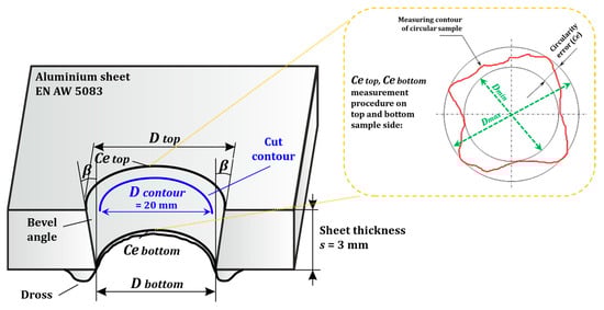 Circular cut quality responses that were analyzed in this paper are circular kerf width Ckw (mm), circular bevel angle β (°), circularity error—top Ce top (mm), and circularity error—bottom Ce bottom (mm). Circular kerf width responses were obtained according to Equation (1). Diameter values at top and bottom side of circular cuts were measured by TESA Micro Hite 3D 454 measuring machine (Tesa Technology, Norderstedt, Germany), Figure 2c. Diameter measurements of the produced circular cuts were performed along the circular edge at five equally spaced points on both the top and bottom sample sides. Mean of these five measurements was taken as diameter top D top (mm) and, respectively, diameter bottom D bottom (mm) value, while maximum and minimum values of these five measurements were taken as diameter maximum Dmax (mm) and, respectively, diameter minimum Dmin (mm) values. Consequently, such derived diameter values, with already known values of cutting contour diameter D contour (mm) and sheet thickness s (mm), served for calculating all mentioned circular cut quality responses according to Equations (1)–(4). Visual representation of all analyzed process responses is given in Figure 3.