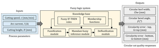 Architecture of fuzzy logic system for modeling relations between plasma cutting process parameters and circular quality responses.