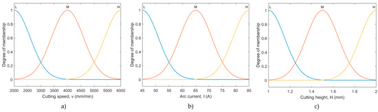 Gaussian membership functions for inputs: (a) cutting speed, (b) arc current, and (c) cutting height.
