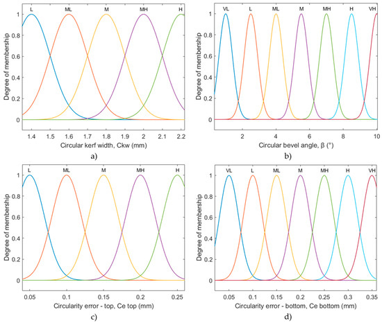 The input and outputs of the fuzzy logic system were described by Gaussian membership functions. For each input, three Gaussian membership functions were defined linguistically as follows: L (low), M (medium), and H (high). Additionally, outputs from the fuzzy logic system were defined by five (the circular kerf width and circularity error—top) and seven (circular bevel angle and circularity error—bottom) Gaussian membership functions linguistically described as: VL (very low), L (low), ML (medium low), M (medium), MH (medium high), H (high), and VH (very high). These defined membership functions for the inputs and outputs are presented in Figure 5 and Figure 6.