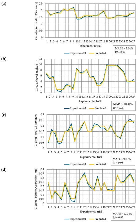 Comparison between experimental and predicted circular quality responses: (a) circular kerf width, (b) circular bevel angle, (c) circularity error—top, (d) circularity error—bottom.