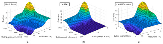 Three-dimensional surface plots of circular kerf width quality response under the influence of parameter interactions: (a) cutting speed–arc current, (b) cutting speed–cutting height, and (c) arc current–cutting height.