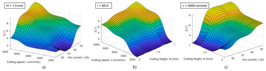 Regarding the analysis of the bevel angle response, it is obvious from Figure 9 that higher cutting speeds and lower arc currents lead to the larger bevel angle. A lower arc current combined with a higher cutting speed results in a reduced amount of plasma jet cutting energy. Consequently, these parameter settings lead to a narrower circular kerf width. Due to the conical shape and characteristics of the plasma jet, the kerf width on the bottom side of the workpiece decreases more rapidly than on the top side, ultimately producing a larger bevel angle [28]. A greater bevel angle requires more demanding post-processing in order to achieve the optimal cut quality of the workpiece.