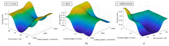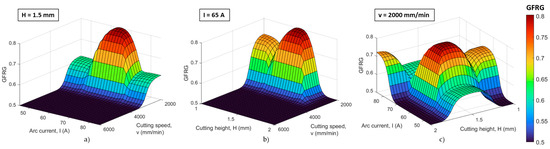 In order to determine the Pareto front of optimal solutions and to discuss the process parameter interactions’ effects on the GFRG values, 3D surface plots were constructed, Figure 21. In these plots, two parameters were varied while the third one was kept constant on a certain level. In Figure 21, the dark red color marks the areas with the highest GFRG values. These areas correspond to the most desirable solutions for the simultaneous optimization of all objectives, the circular quality response functions: (Ckw) min, (β) min, (Ce top) min, and (Ce bottom) min. These multi-objective optimization solutions correspond to the next plasma jet cutting process conditions: v = 2000 mm/min, I = 65 A, H = 1–1.5 mm/v = 2000 mm/min, I = 85 A, H = 2 mm.