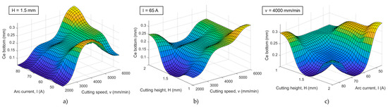Three-dimensional surface plots of circularity error—bottom quality response under the influence of parameters interactions: (a) cutting speed–arc current, (b) cutting speed–cutting height, and (c) arc current–cutting height.