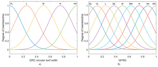 Gaussian membership functions for (a) input: GRC circular kerf width and (b) output: GFRG.