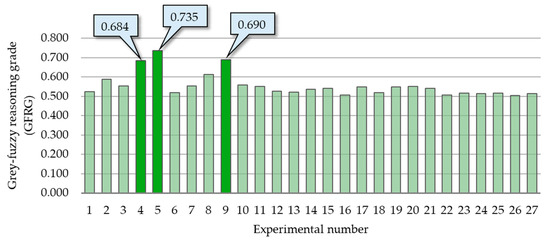 With the aim of defining the functional dependencies between the inputs and the outputs using the experimental results and previous experience, a set of 27 fuzzy IF-THEN rules was generated. A graphical representation of these rules is shown in Figure 14. First, four yellow columns define the fuzzy logic system inputs: the GRCs of the circular kerf width, circular bevel angle, circularity error—top, and circularity error—bottom, while the fourth blue one defuzzified the output: the GFRG. The settings of the fuzzy logic system inputs were designated to present the highest value of the GFRG output. The fuzzy logic reasoning process and calculation of the GFRG values were performed, as before in MATLAB R2023a Fuzzy logic toolbox. The defuzzified exact values of the GFRG are presented in Figure 15. The dark green columns represent the experimental trials (fourth, fifth, and ninth) with the three highest GFRG values. These solutions lie on the Pareto front, representing a set of compromise solutions for the simultaneous optimization of multiple objective functions: (Ckw) min, (β) min, (Ce top) min, and (Ce bottom) min. The highest GFRG value was achieved in the fifth experiment. The corresponding input process parameter levels are v = 2000 mm/min, I = 65 A, and H = 1.5 mm. This result corresponds to the GRG rank presented in Table 6’s last column.