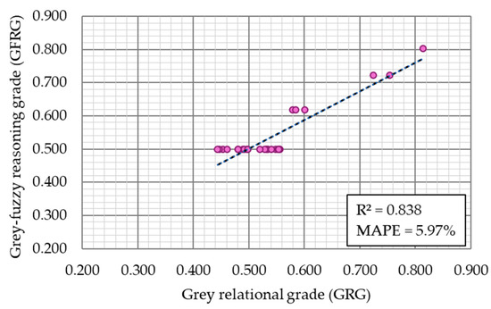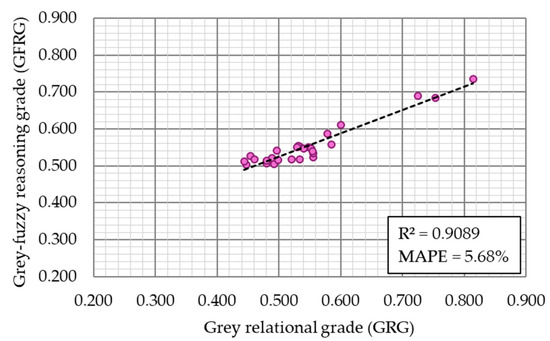 In order to validate THE prediction accuracy of the developed fuzzy logic model, a comparison between the calculated GRG and predicted GFRG values was performed. The coefficient of determination (R2) and mean absolute percentage error (MAPE) were applied as validation measures. The comparison results are presented in Figure 16. The obtained R2 value of 0.9089 and MAPE of 5.68% indicate a strong agreement between the calculated GRG and predicted GFRG values, further confirming the accuracy of the developed fuzzy logic model.