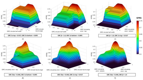 Three-dimensional surface plots of GRC circular quality response interactions: (a) circular kerf width and circular bevel angle, (b) circular kerf width and circularity error—top, (c) circular kerf width and circularity error—bottom, (d) circular bevel angle and circularity error—top, (e) circular bevel angle and circularity error—bottom, and (f) circularity error—top and circularity error—bottom effects on GFRG values.