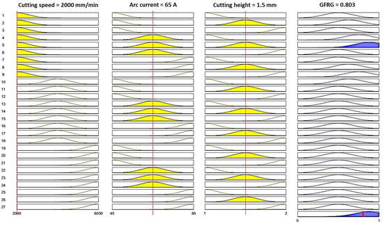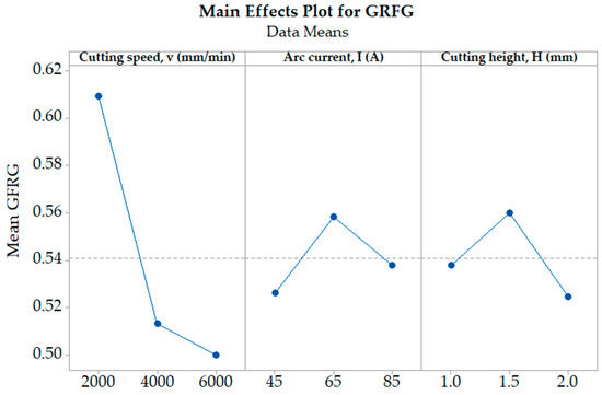 In order to analyze more precisely the influences of individual process parameters on the GFRG output, the main effects plots were created, Figure 20. These plots were generated based on the average fuzzy-logic-predicted GFRG values and serve to enhance the determination of the optimal process conditions and the identification of the most significant process parameters. The steep slope of the cutting speed’s blue line from Figure 20 reveals that this parameter has the highest influence on the GFRG while the other two parameters are less significant. The blue line points from this plot, that has the highest mean value, define the optimal process parameter levels. This corresponds to the next process parameter settings: v: 2000 mm/min, I: 65 A, H: 1.5 mm. Table 7 confirms these findings. The bold numbers in this table define the highest mean GFRG values for each parameter and, consequently, their optimal operating levels. The last column in Table 7 determines the significance rank of all parameters based on the range between the highest and lowest mean GFRG value. According to that, it can be concluded that the cutting speed has the highest significance for the GFRG, followed by the cutting height and, finally, the arc current. This is affirmed also by the ANOVA results, Table 8. ANOVA was performed with a confidence level of 95%. From the last column, it is visible that the p-value of the cutting speed is lower than 0.05, which confirms the previous conclusion that it has the greatest influence on the GFRG.