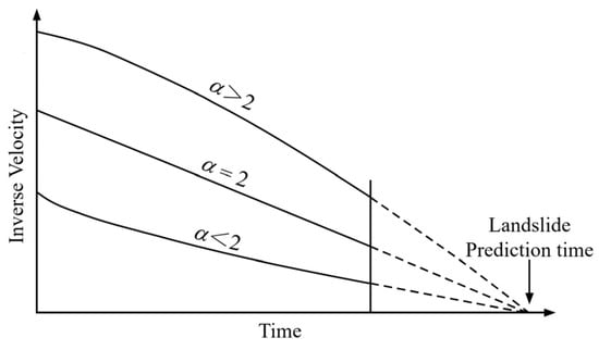 where V represents deformation velocity, t denotes time, tf corresponds to predicted failure time, and A and α are material-specific constants. Following Voight’s [16,17] empirical validation, the exponent α typically assumes a value of 2 for geological materials, which yields the simplified formulation: