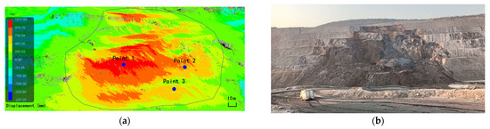 (a) Slope displacement monitoring cloud map, the area surrounded by blue lines is the landslide area, and the blue dots are the three points used for single point prediction study (b) Photo of landslide.