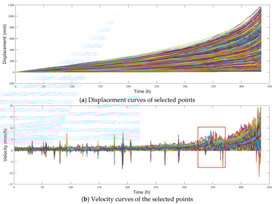 To facilitate systematic investigation and analysis, 120 monitoring points were randomly selected within the landslide-affected zone. The monitoring points are arranged in a relatively uniform pattern spanning the landslide body. Given the impracticality of visually representing all monitoring locations in Figure 3a, only three representative points utilized for single-point prediction are explicitly annotated. The displacement and velocity distribution curves derived from the 120 monitoring points are presented in Figure 4.