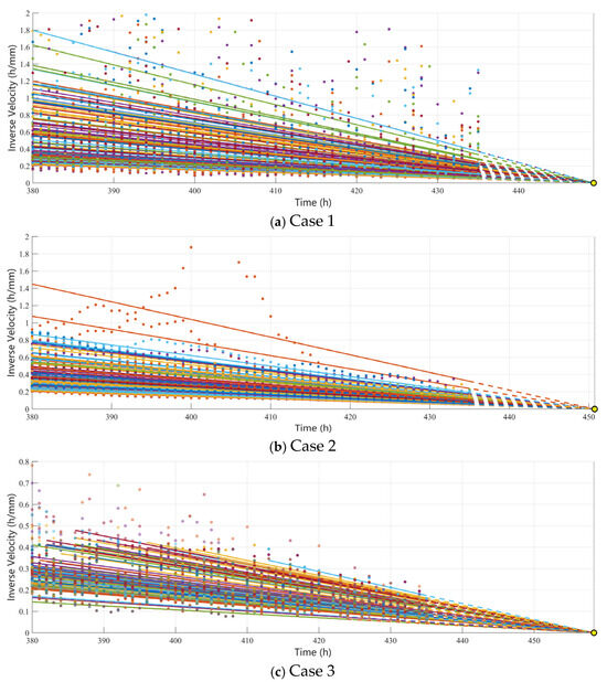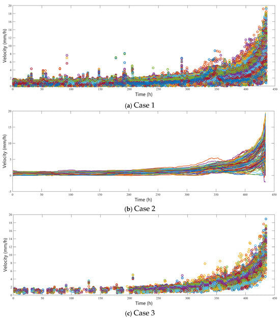 For comparative analysis, temporal smoothing with a window length of 30 was applied to the velocity dataset, generating the refined velocity profile in Figure 5b (Case 2). This approach aligns with conventional noise-reduction practices in velocity-based failure prediction [22].