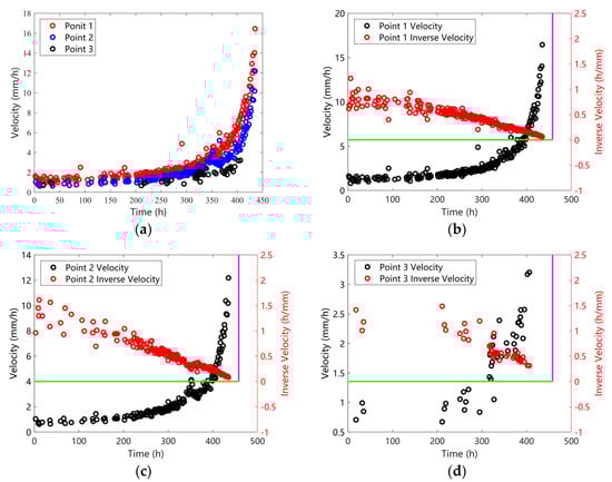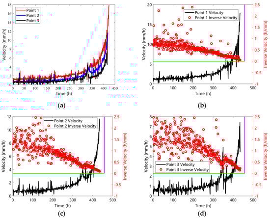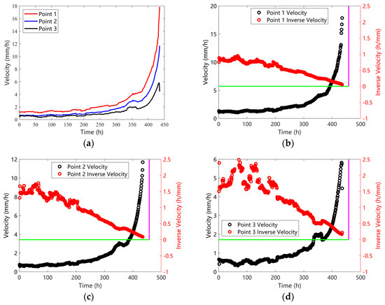 (a) Velocity curves of different points (b) Velocity and inverse velocity of point 1 (c) Velocity and inverse velocity of point 2 (d) Velocity and inverse velocity of point 3. The pink line represents the time when the landslide occurred. The green line represents the position where the inverse velocity is 0.