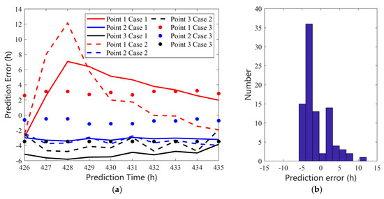 Figure 9 illustrates the error distributions of failure time predictions across three monitoring points under Cases 1–3. Key observations include: (1) Prediction errors for all cases largely span −5 to +5 h, with Case 1 and Case 2 exhibiting pronounced variability at Point 1; and (2) Points 2 and 3 demonstrate relatively consistent errors (>2 h) across scenarios, though concurrent occurrences of premature (negative errors) and delayed (positive errors) predictions persist. This inconsistency, particularly the coexistence of over- and under-predictions, undermines definitive failure time determination, highlighting the necessity for developing more stable and reliable prediction methodologies.
