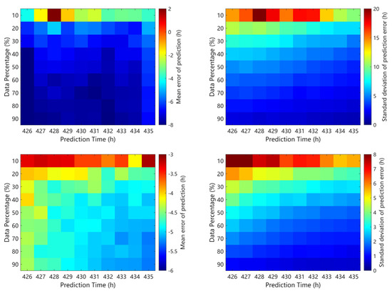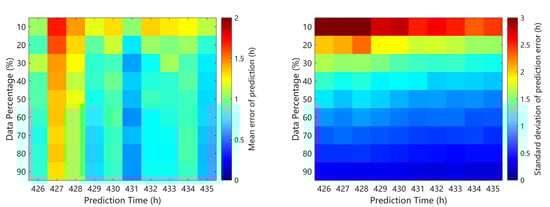 As demonstrated in Figure 12, Case 1 exhibits mean prediction errors ranging from −8 h to +2 h, with standard deviations spanning 0–20 h, indicative of substantial uncertainty. Case 2 shows improved yet systematic prediction (mean error: −6 h to −3 h; standard deviation: 0–8 h). Notably, increasing the spatial sampling density in Cases 1 and 2 paradoxically amplifies mean errors while marginally reducing standard deviations. This counterintuitive behavior arises from the inherent limitations of rudimentary data exclusion and fitting strategies, where expanded datasets inadvertently propagate low-quality measurements, exacerbating prediction inaccuracies.