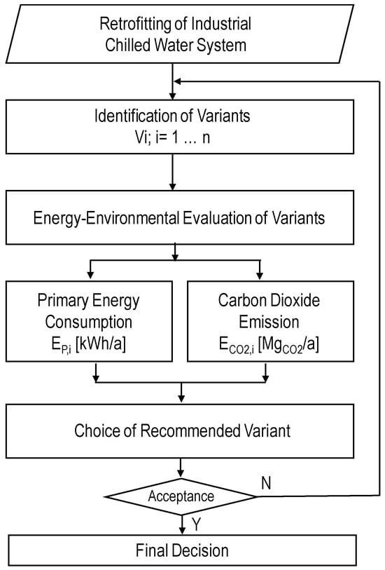 In order to evaluate chilled water retrofitting variants, the energy-environment method was proposed. The general algorithm of the proposed method is shown in Figure 1.