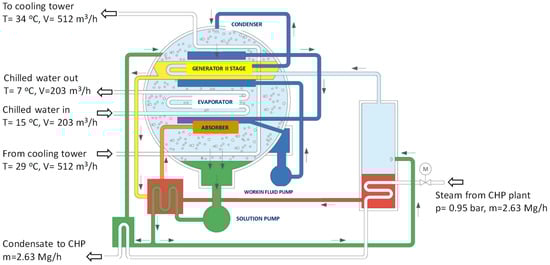 Other elements of the system were in line with the accepted basic variant for the modernization of the chilled water system. A schematic of the connections of the 1.65 MW dual-stage absorption water chiller is shown in Figure 6 [28].