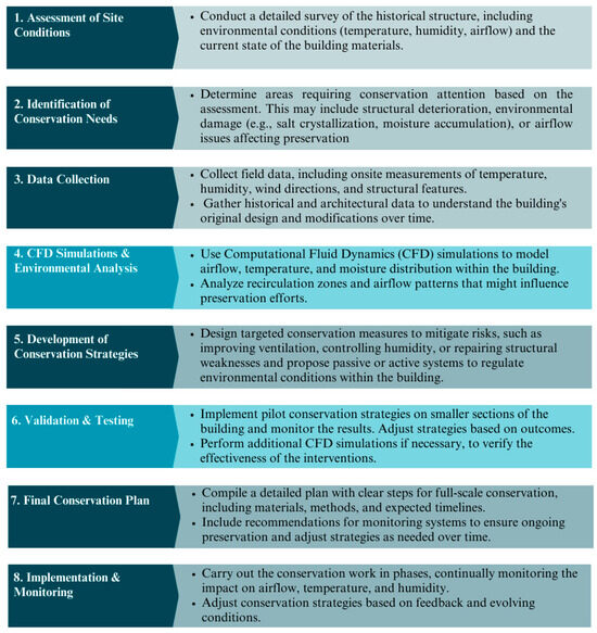 The current study explored airflow behavior within the ancient ventilation system of the Na Phra Meru Historical Temple (Wat Na Phra Meru) situated near the Ayutthaya Historical Park, Thailand. Previous research did not fully capture the complexity of airflow within this unique architectural structure, leaving gaps in our understanding that are crucial for archaeologists to fill in formulating effective preventive conservation strategies [17,18,23]. The current research study aimed to analyze the recirculation zones formed by different wind directions, focusing on their role in moisture accumulation and uniformity. Additionally, this study examined the distribution of air properties to evaluate airflow patterns and their environmental impact within the Temple. CFD simulations were used to achieve this, incorporating local boundary conditions obtained from onsite measurements. The accuracy of the simulations was validated using academic test cases and experimental field data. The findings from this study should enhance scientific understanding of airflow dynamics in historical structures by providing insights that can inform the improvement of ventilation systems within the ordination hall. Furthermore, the results should help to identify potential risks of deterioration within the Temple, supporting the development of more effective conservation measures. The conservation plan workflow is illustrated in Figure 1, highlighting the critical role of CFD in steps 4 and 6, serving as a key tool for developing sustainable conservation strategies.